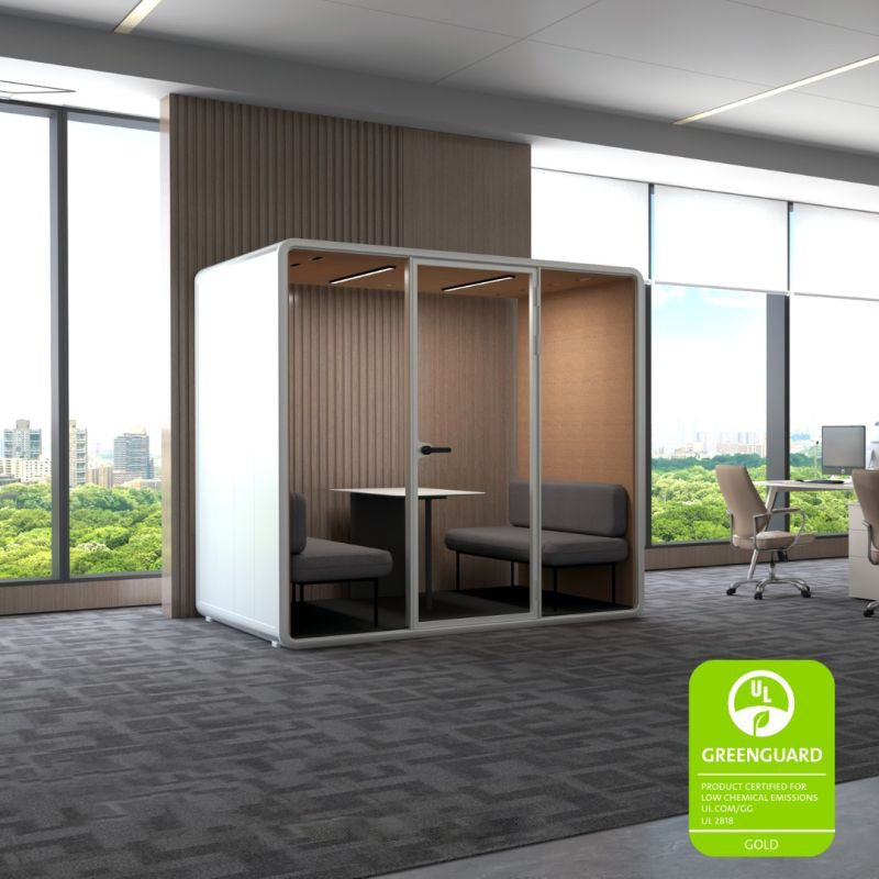 The Collaborative Booth offers the same high-level noise reduction as the Double Booth but accommodates up to four people. Perfect for small team meetings and group collaborations, it provides a quiet, comfortable space for productive discussions in any environment, it is also notorious for doing meetings in high volume areas.